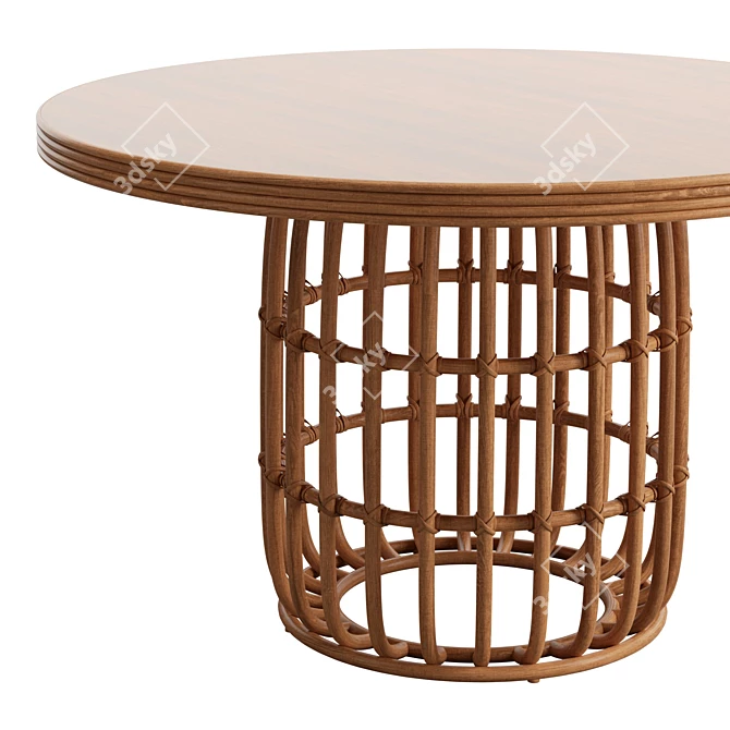The ovular design of this dining table features exquisite layered construction, evoking an intriguing visual appeal. Adorned with mindi wood and rattan elements, it exudes a perfect fusion of natural warmth and boho charm. Resting upon a caged pedestal base, this table stands tall with a height of 30", while its legs extend to 28", providing stability and durability for your 3D room design.