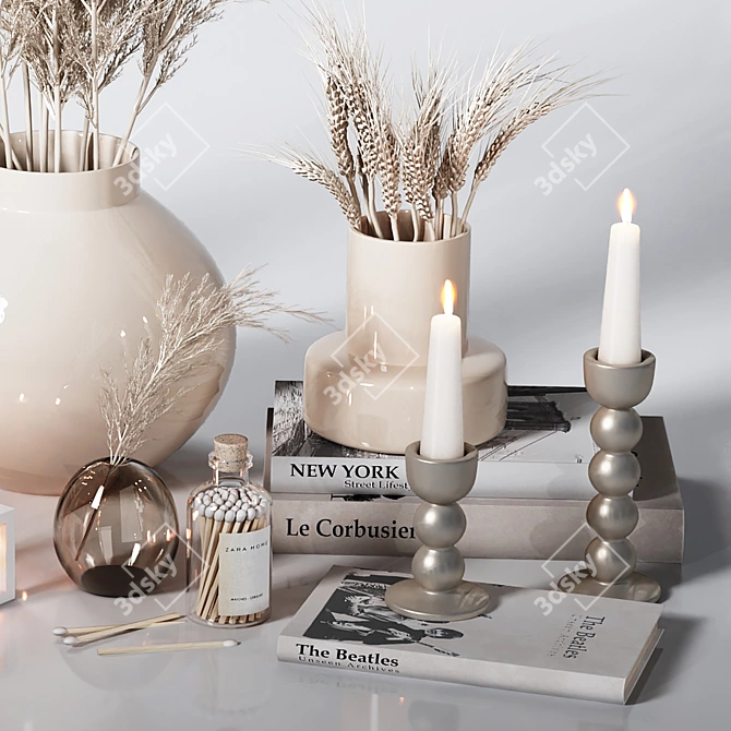Our decorative set includes an array of meticulously crafted 3D replicas, such as dried pampas branches in a vase, dried wheat branches in a vase, and two chrome candle holders of different sizes. Each 3DS Max model is designed with an eye for detail, boasting high-quality textures that mirror the real-life counterparts seamlessly.