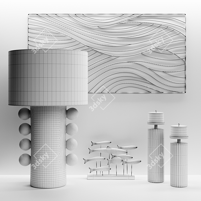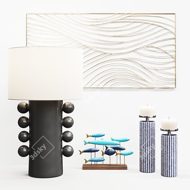 Upgrade your living space with the exquisite **Modern Console Table Set 3D model**. This elegant collection includes the Kelly Wearstler TIGLIA TALL lamp, the Maisons du monde DUNIA wire art panel, the Maisons du monde XENIA metal fish figurines, and the Uttermost HAVANA candle holders.