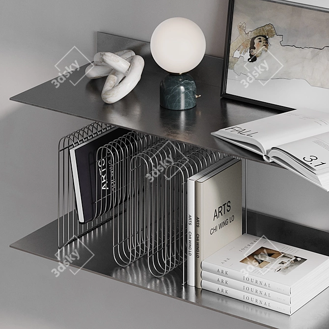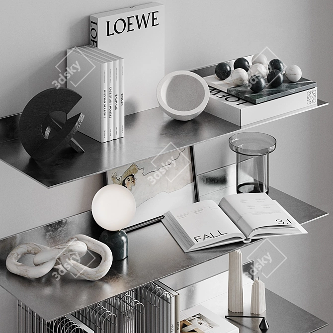 Elevate your interior aesthetics with the Glowe Decorative Set that includes metal shelves, the Totem sculpture, Stone Balls decor, the CURVA magazine holder, the Cretta table lamp, the Azur chain, candles from The Loom, and the Numa vase. Each item is crafted to perfection, offering a seamless blend of style and functionality for your 3D interior setting.